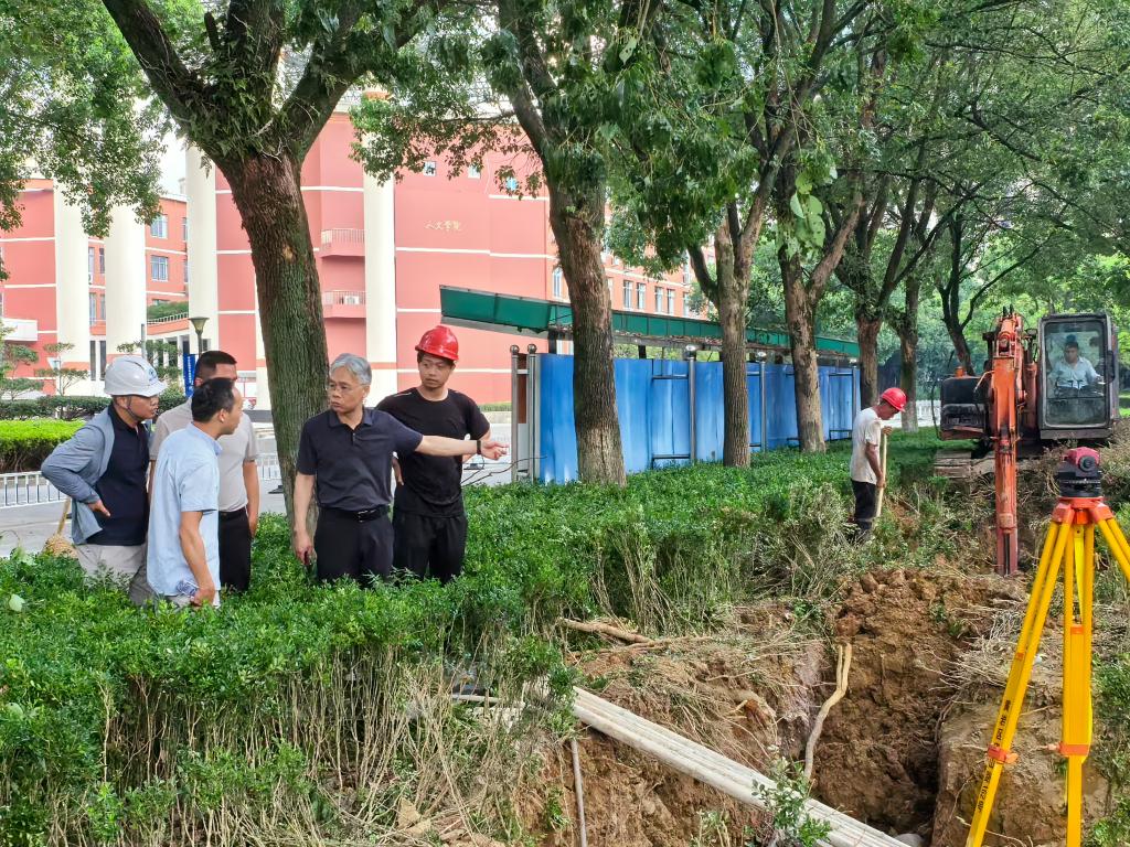 杨健国实地查看了临海校区地下污水管网修复、第一食堂改造及椒江校区生活区加压消防管路改造、心湖幼儿园厨房装修改造、电动自行车充电车棚建设、2024级新生寝室维修等项目施工现场,并认真听取各个项目的推进情况汇报。他指出,暑期是校园改造的黄金时期,在改造过程中,一要讲安全,扎实做好现场安全文明施工各环节,面对室内外高温作业环境,施工单位要合理安排施工时间,注意人员防暑、施工安全;二要讲质量,从严从细做好施工监督管理,严格管控施工、验收等环节,保质保量完成各改造项目;三要讲进度,科学合理细化施工方案,按照时间节点有序完成,对于开挖道路造成路面、绿植损坏的修护也要及时完成,确保学校开学正常的教学、生活秩序。
